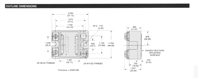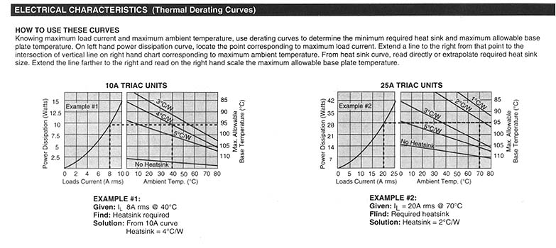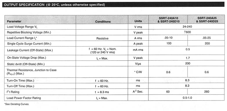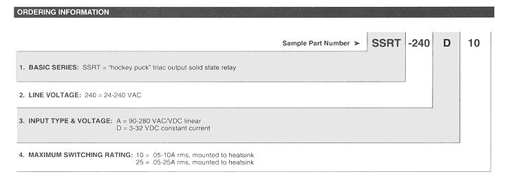 POTTER & BRUMFIELD SSRT series "HOCKEY PUCK" SOLID STATE RELAY WITH SNUBBERLESS TRIAC OUTPUT File E29244 File E29244 UL Recognized for Canada · Standard "hockey puck" package. · Exposed ceramic base plate for reduced themal resistance. · Floating terminal design. · Low cost snubberless triac outputs. · 10A & 25A rms versions. · AC & DC input versions. · 4000V rms isolation. Form: 1 Form A (SPST-NO). Duty: Continuous. Isolation: 4000V rms minimum, input - output. Isolation Resistance: 10^10 ohms @ 500VDC minimum. Capacitance: 10 pf maximum (input to output). Temperature Range: Storage: -40"C to +120"C Operating Temperature: -25"C to + 80"C Case Material: Plastic, UL rated 94V-0. Base Plate Material: Ceramic. Case and Mounting: Refer to outline dimension. Termination: Refer to outline dimension. Approximate Weight: 3.5 oz. (98 g). Parameter AC/DC Input/AC Output DC Input/AC Output Control Voltage Range Vin 90-280VAC/VDC 3-32VDC Must Operate Voltage Vin(op)(Max.) 90VAC/VDC 3VDC Must Release Voltage Vin(rel)(Min.) 1OVAC/VDC 1VDC Input Current Input Current 15mA Max. @ 9OVAC 15mA Max. @ 5VDC 52K .jpg (780 pixels wide). HOW TO USE THESE CURVES Knowing maximum load current and maximum ambient temperature, use derating curves to determine the minimum required heat sink and maximum allowable base plate temperature. On left hand power dissipation curve, locate the point corresponding to maximum load current. Extend a line to the right from that point to the intersection of vertical line on right hand chart corresponding to maximum ambient temperature. From heat sink curve, read directly or extrapolate required heat sink size. Extend the line farther to the right and read on the right hand scale the maximum allowable base plate temperature. Thermal Derating Curves (62K .jpg 780 pixels wide). HEATSINK DIMENSIONS: · We recommend that solid State Relay Modules be mounted to a heatsink sufficient to maintain the module's base temperature at less than 85 degrees C under worst case ambient temperature and load conditions. · The heatsink mounting surface should be a smooth (30-40 micro-inch finish), flat (30-40 micro-inch flatness across mating area), un-painted surface which is clean and free of oxidation. · An even coating of thermal compound (Dow Coming DC340 or equivalent) should be applied to both the heatsink and module mounting surfaces and spread to a uniform depth of .002" to eliminate all air pockets. · The module should be mounted to the heatsink using two #l0 screws. The mounting screws should be torqued to 10 inch-pounds by alternately tightening the screws one quarter turn at a time.