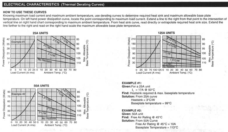 72K .jpg (780 pixels wide). HOW TO USE THESE CURVES Knowing maximum load current and maximum ambient temperature, use derating curves to determine the minimum required heat sink and maximum allowable base plate temperature. On left hand power dissipation curve, locate the point corresponding to maximum load current. Extend a line to the right from that point to the intersection of vertical line on right hand chart corresponding to maximum ambient temperature. From heat sink curve, read directly or extrapolate required heat sink size. Extend the line farther to the right and read on the right hand scale the maximum allowable base plate temperature. Thermal Derating Curves (68K .jpg 780 pixels wide). HEATSINK DIMENSIONS: · We recommend that solid State Relay Modules be mounted to a heatsink sufficient to maintain the module's base temperature at less than 85 degrees C under worst case ambient temperature and load conditions. · The heatsink mounting surface should be a smooth (30-40 micro-inch finish), flat (30-40 micro-inch flatness across mating area), un-painted surface which is clean and free of oxidation. · An even coating of thermal compound (Dow Coming DC340 or equivalent) should be applied to both the heatsink and module mounting surfaces and spread to a uniform depth of .002" to eliminate all air pockets. · The module should be mounted to the heatsink using two #l0 screws. The mounting screws should be torqued to 10 inch-pounds by alternately tightening the screws one quarter turn at a time.