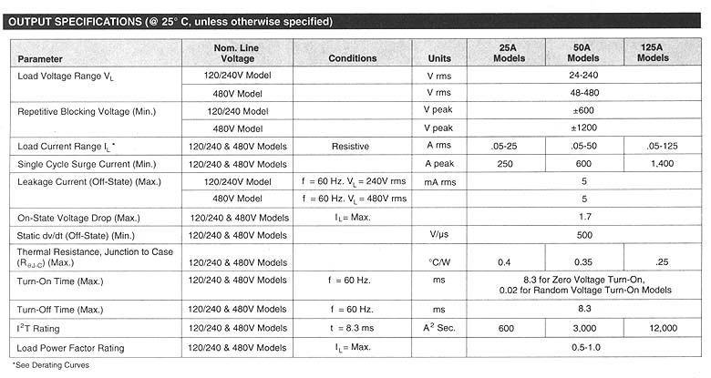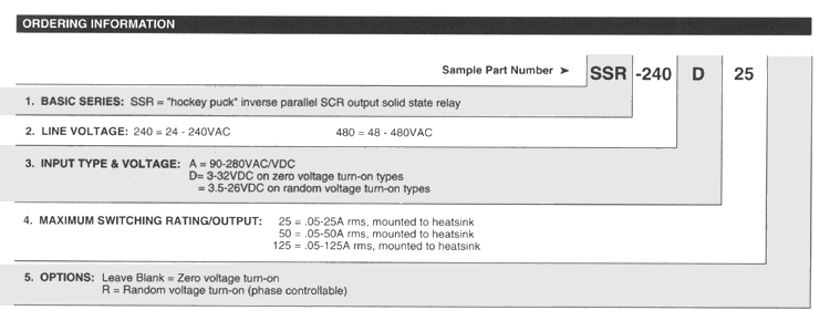 POTTER & BRUMFIELD SSR series "HOCKEY PUCK" SOLID STATE RELAY PAIRED SCR OUTPUT File E29244 File E29244 UL Recognized for Canada · Standard "hockey puck" package. · Inverse parallel SCR output. · 25, 50, & 125A rms versions. · 120/240VAC & 480VAC output types. · Zero voltage and random voltage turn-on versions. · AC & DC input versions. · 4,000V rms optical isolation. · Exposed ceramic base plate for reduced thermal impedance. · Floating terminal design. Form: 1 Form A (SPST-NO). Duty: Continuous. Isolation: 4000V rms minimum, input - output. Isolation Resistance: 10^10 ohms @ 500VDC minimum. Capacitance: 10 pf maximum (input to output). Temperature Range: Storage: -40"C to +120"C Operating Temperature: -25"C to +80"C Case Material: Plastic, UL rated 94V-0. Base Plate Material: Ceramic. Case and Mounting: Refer to outline dimension. Termination: Refer to outline dimension. Approximate Weight: 3.5 oz. (98 g).