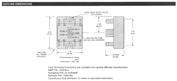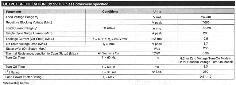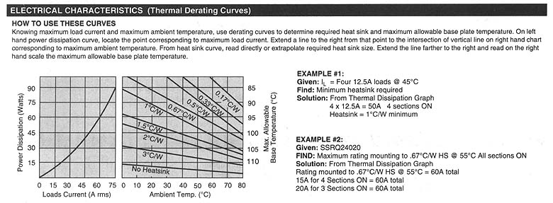 POTTER & BRUMFIELD SSRQ series QUAD AC OUTPUT SOLID STATE RELAY File E29244 File E29244 UL Recognized for Canada · Four electically independent solid state relays in a single industry standard "hockey puck" package. · 20A rms, triac outputs. · DC input control. · Zero voltage and random voltage turn-on versions. · 2500V rms optical isolation. Form: 4 Form A (SPST-NO). Duty: Continuous. Isolation: 2500V rms minimum, input - output. Isolation Resistance: 10^10 ohms @ 500VDC minimum. Capacitance: 10 pf maximum (input to output). Temperature Range: Storage: -40"C to +120"C Operating Temperature: -25"C to + 80"C Case Material: Plastic, UL rated 94V-0. Base Plate Material: Ceramic. Case and Mounting: Refer to outline dimension. Termination: Refer to outline dimension. Approximate Weight: 3.10 oz. (81 g). Parameter Zero V Turn-on Random V Turn-on Control Voltage Range Vin 3-32VDC 4-15VDC Must Operate Voltage Vin(op)(Max.) 3VDC 4VDC Must Release Voltage Vin(rel)(Min.) 1VDC 1VDC Input Current (Max.) Vin=5VDC 15mA DC 15mA DC 50K .jpg (780 pixels wide). HOW TO USE THESE CURVES Knowing maximum load current and maximum ambient temperature, use derating curves to determine the minimum required heat sink and maximum allowable base plate temperature. On left hand power dissipation curve, locate the point corresponding to maximum load current. Extend a line to the right from that point to the intersection of vertical line on right hand chart corresponding to maximum ambient temperature. From heat sink curve, read directly or extrapolate required heat sink size. Extend the line farther to the right and read on the right hand scale the maximum allowable base plate temperature. Thermal Derating Curves (61K .jpg 780 pixels wide). HEATSINK DIMENSIONS: · We recommend that solid State Relay Modules be mounted to a heatsink sufficient to maintain the module's base temperature at less than 85 degrees C under worst case ambient temperature and load conditions. · The heatsink mounting surface should be a smooth (30-40 micro-inch finish), flat (30-40 micro-inch flatness across mating area), un-painted surface which is clean and free of oxidation. · An even coating of thermal compound (Dow Coming DC340 or equivalent) should be applied to both the heatsink and module mounting surfaces and spread to a uniform depth of .002" to eliminate all air pockets. · The module should be mounted to the heatsink using two #l0 screws. The mounting screws should be torqued to 10 inch-pounds by alternately tightening the screws one quarter turn at a time.