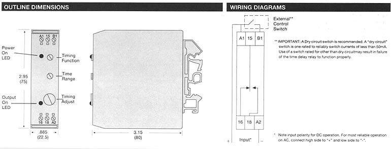 POTTER & BRUMFIELD CND series 5 programmable timing modes. 0.5 sec 10 100 min. programmable timing range. Universal input (24-240VAC/VDC) 10A output relay with SPDT contacts. Timing range and timing function switch selectable. Time adjust is potentiometer adjustable. Fits 35mm DIN track. · Operate · Interval · Release · Recycler · One Shot