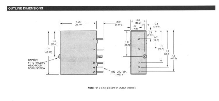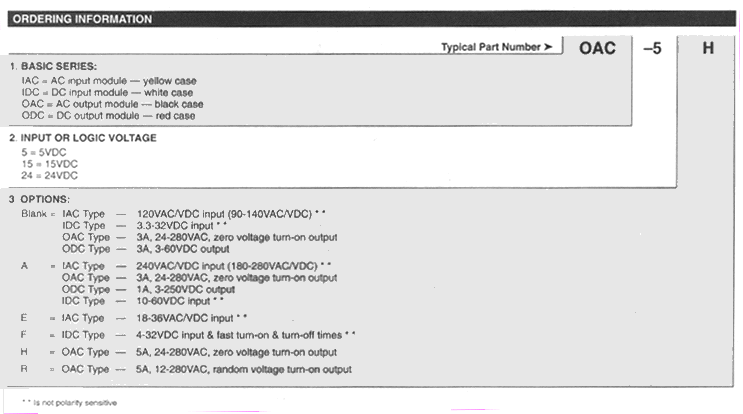 FEATURES: All I/O Modules · Industry standard package and pin-out. · Color coded by function. · 4,000V rms optical isolation. · High immunity to false operation. · Series compatible. · Output modules can be controlled from sinking or sourcing logic. · Compatible with 210 series mounting boards. All I/O Modules Switch Form: 1 Form A (SPST-NO) Duty: Continuous Isolation: 4,000V rms, 60 Hz. Capacitance: 8pf Typical (input to output) Operating Temperature: -30C to +80C Storage Temperature: -40C to +85C Potting Compound Flammability: UL94V-O Approximate Weight: 1.38 oz. (35g). (approx. 23K .gif @ 750 pixels wide). BUILD YOUR OWN PART NUMBER: A 31K graphic (GIF) of Ordering Information. This information will 'build' a part number from a list of available specifications. |