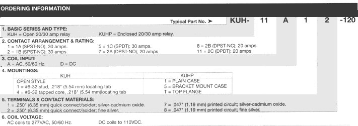 POTTER & BRUMFIELD KUH series 30 AMP POWER RELAY File E22575 File LR15734-123 · AC coils 6-277VAC 50/60 Hz., DC 6-110VDC. · Contact arrangement up to DPDT. · .250" combination push-on-/solder terminals or PC terminals. · Side flange and top flange mounting. · 6-32 stud or tapped core mount (open models). · Designed to meet VDE space requirements. · Class B coil insulation. Arrangements: 1 Form C (SPDT) and 2 Form C (DPDT). Material: Silver or silver-cadmium oxide. Expected Mechanical Life: 10 million operations.