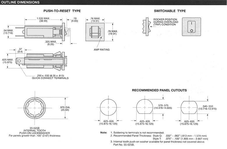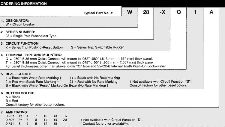 POTTER & BRUMFIELD W28 series SWITCHABLE OR PUSH TO RESET FUSEHOLDER-TYPE THERMAL CIRCUIT BREAKER FEATURES · Switchable version combines on-off switch and circuit protection in a single unit. · Approved to many international standards (push to reset type). · Replaces slow blow glass cartridge fuse. · Labor-saving snap-in mounting. · Button extends for visual trip indication on push to reset model. · Rocker on switchable model moves to "overload" position upon trip.